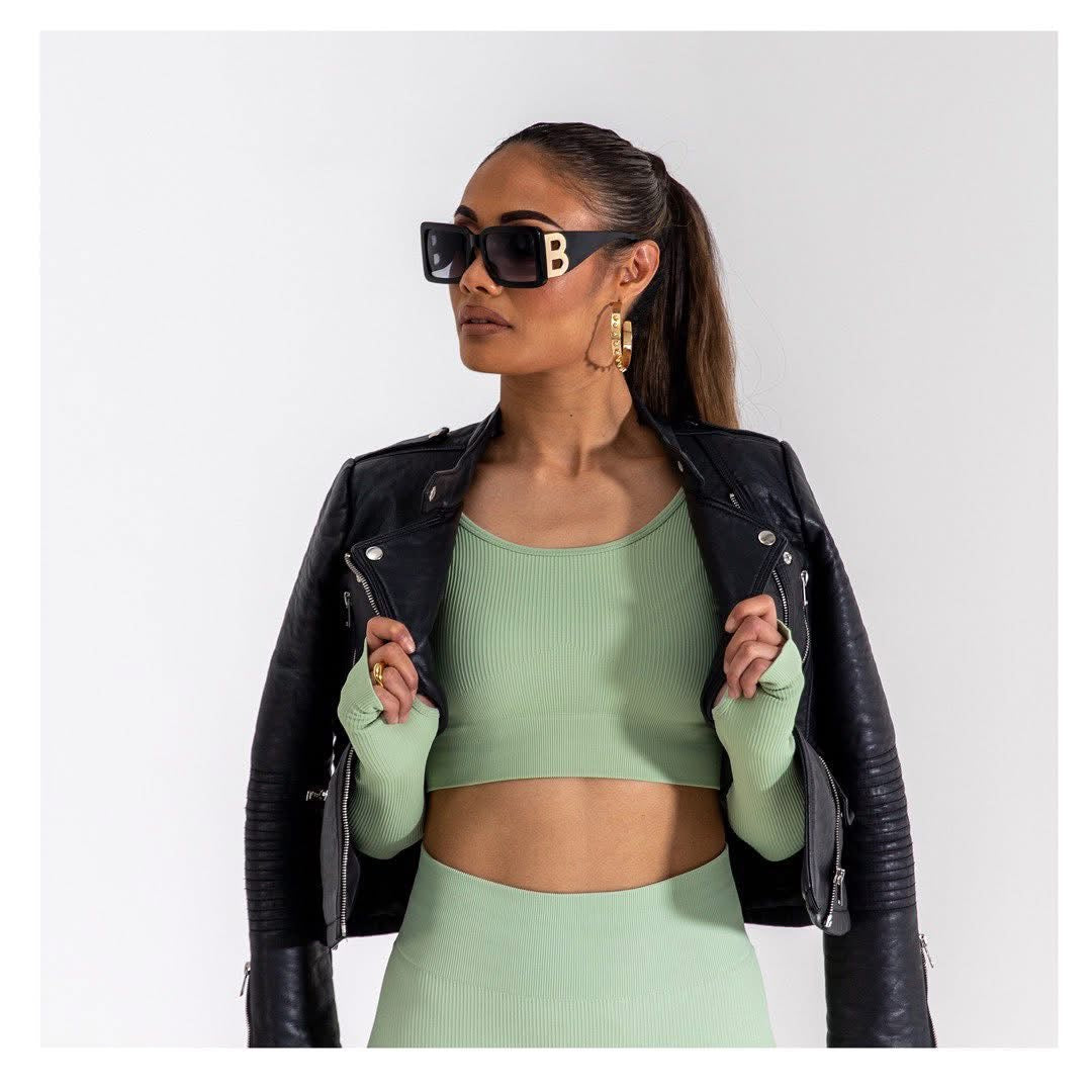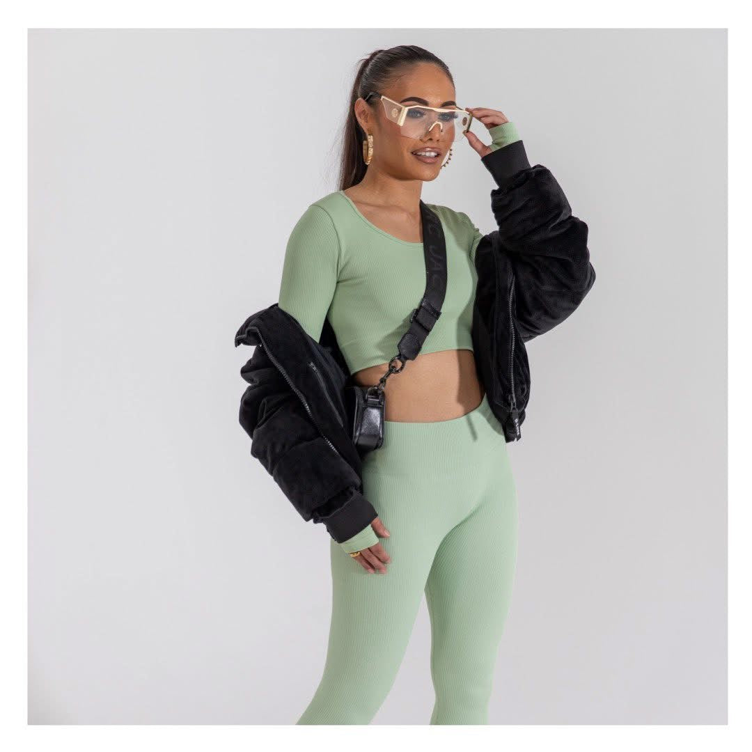 The top is designed as a modern cropped style, accentuated with convenient thumb holes for a secure, sporty look.